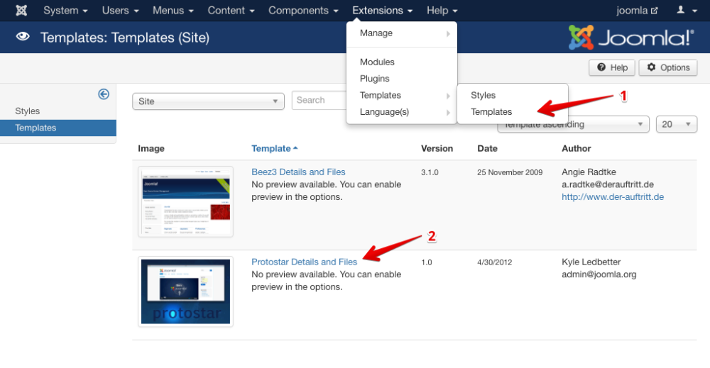 - Log into your Joomla admin panel and go to "Extensions" → "Template Manager".