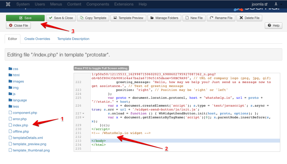 - Go back to Joomla panel, paste the widget code before </body> tag.
