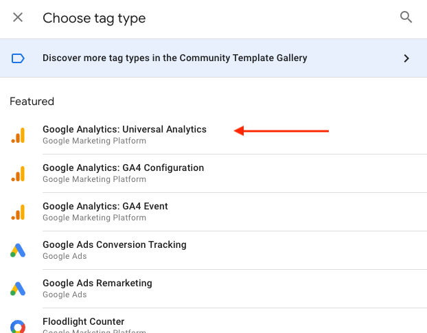 To initiate setup, click Tag Configuration. For tag type, select Universal Analytics