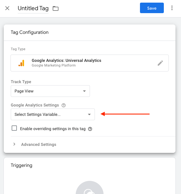 For Track Type, select Page View. Select or create new Google Analytics Settings Variable: