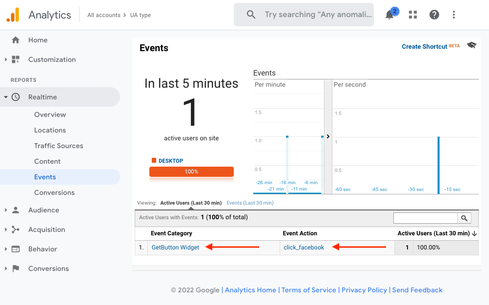 Use the Realtime Events report to see real time firing of events. Report lists the top 20 event categories over the past 30 minutes, sorted by number of users interacting with that event.
