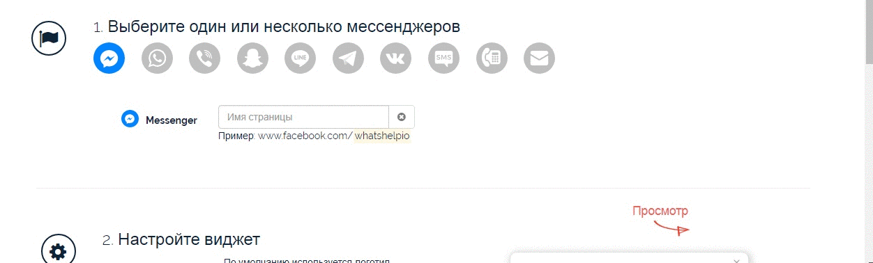 Пример того, что нужно писать в поле, находится под полем ввода. Например, для FB и ВК - это имя страницы, для WhatsApp или звонка - номер телефона.